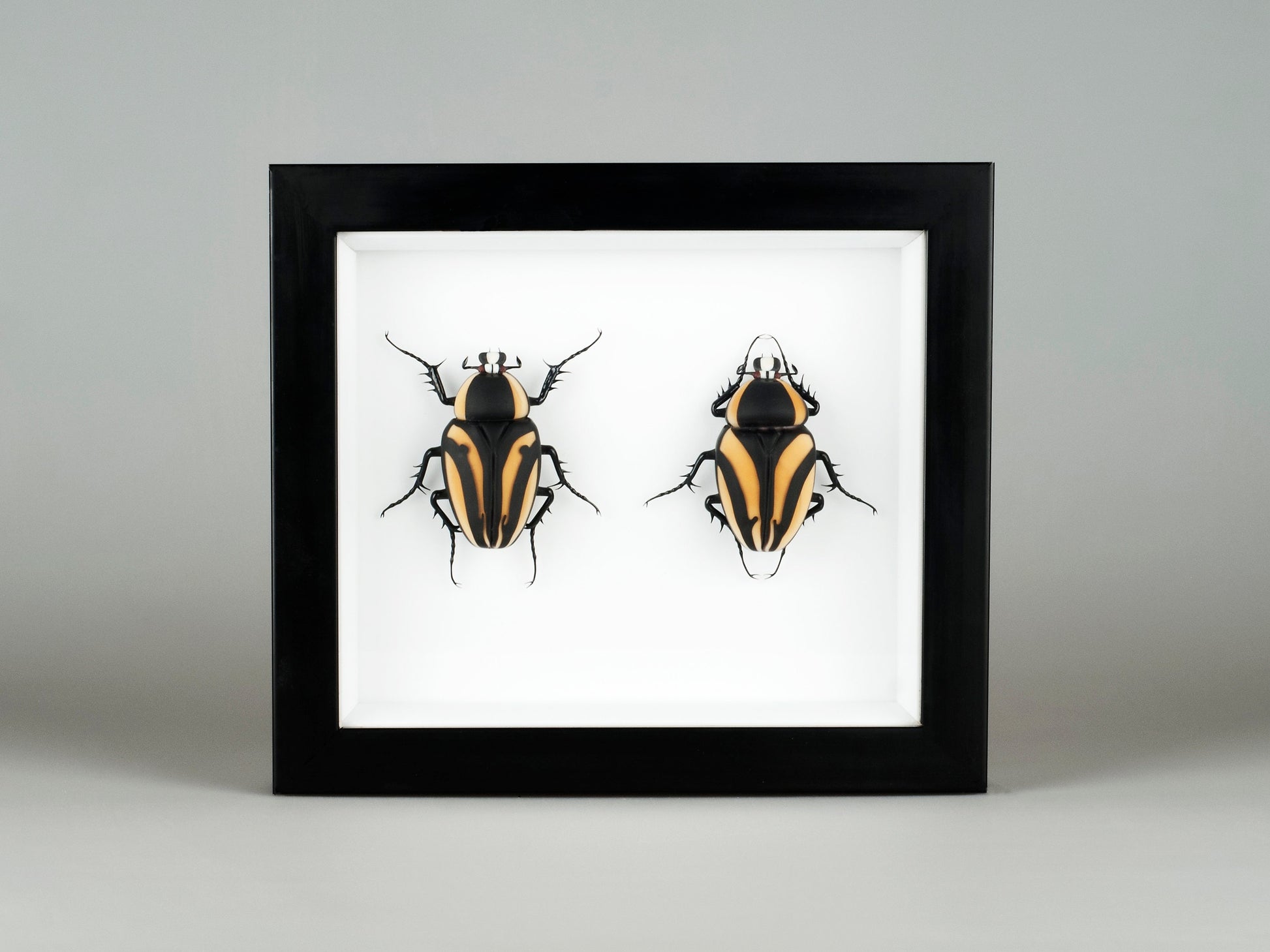 Coleotteri di vetro realizzati a lume con una cornice di legno nero.