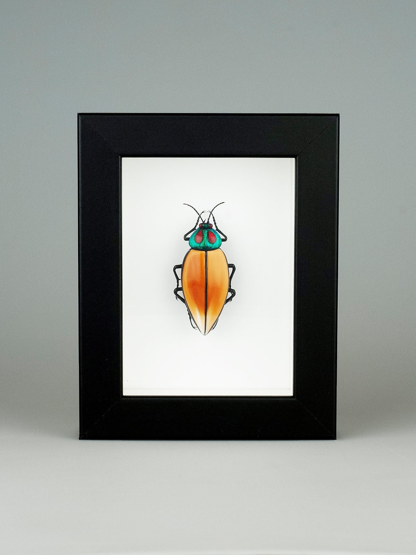 Scarabeo di vetro realizzato a lume con una cornice in legno nero.