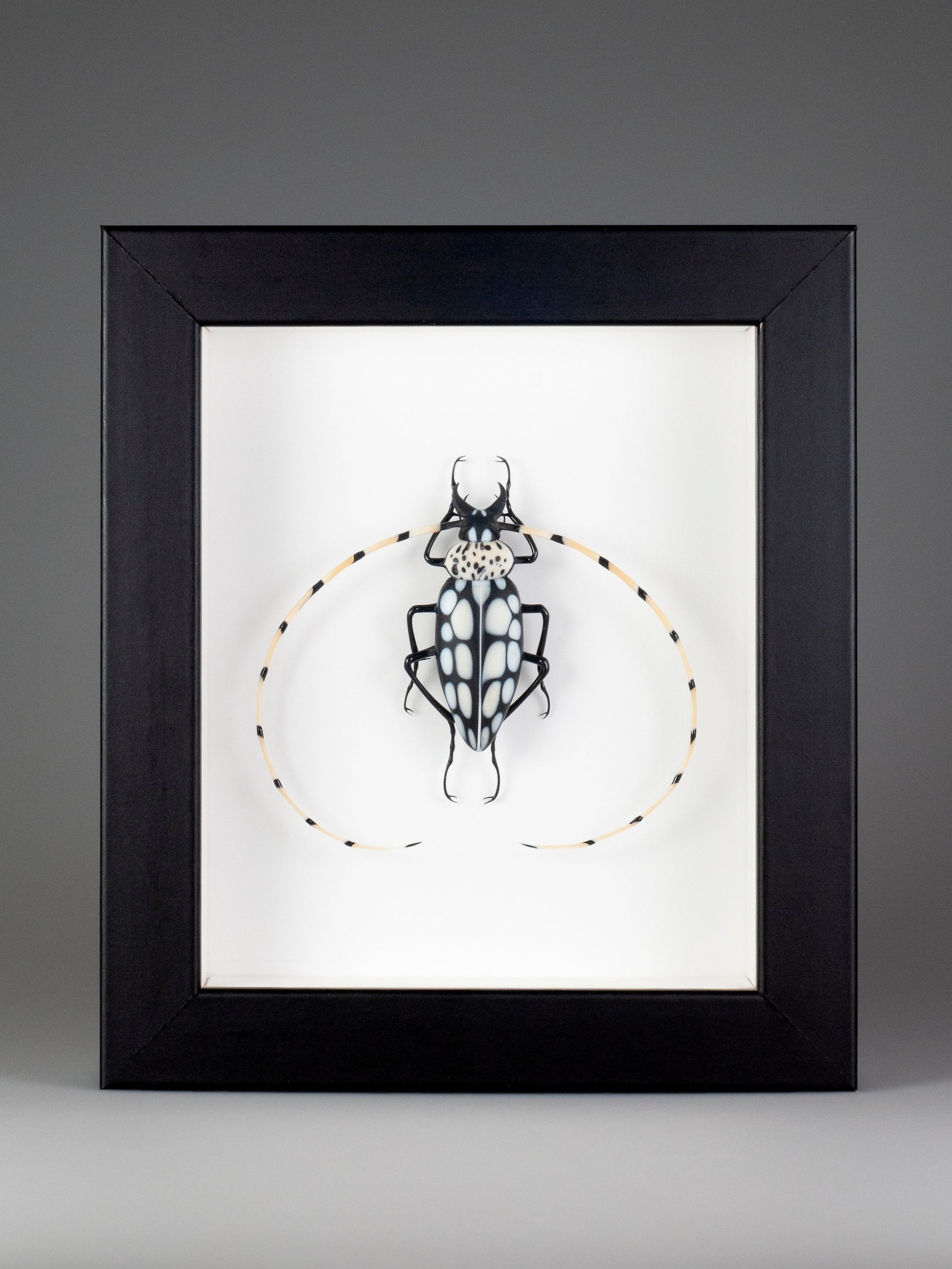 Scarabeo in vetro di Murano realizzato a lume in una cornice di legno nero.