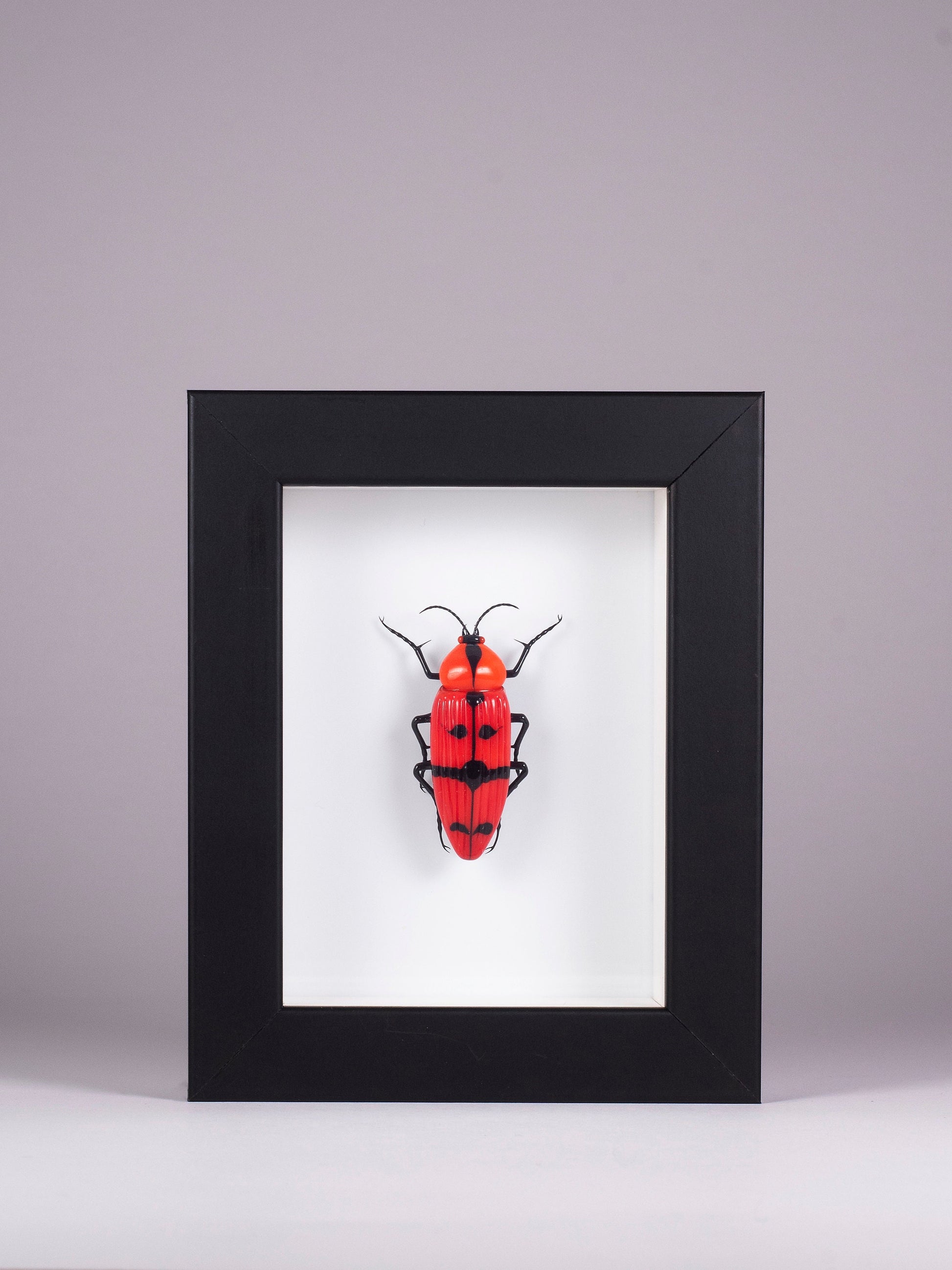 Scarabeo in vetro di Murano lavorato a lume con cornice in legno nero.