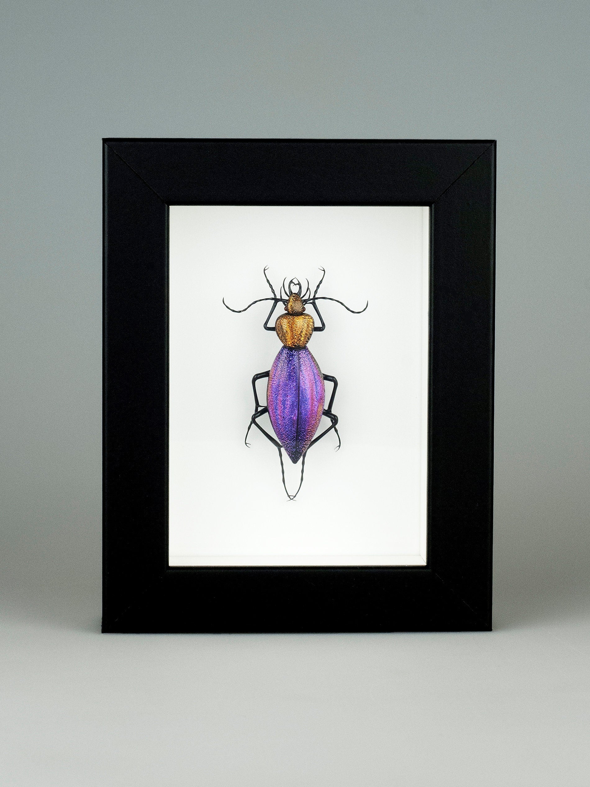 Scarabeo di vetro realizzato a lume con una cornice in legno nero.