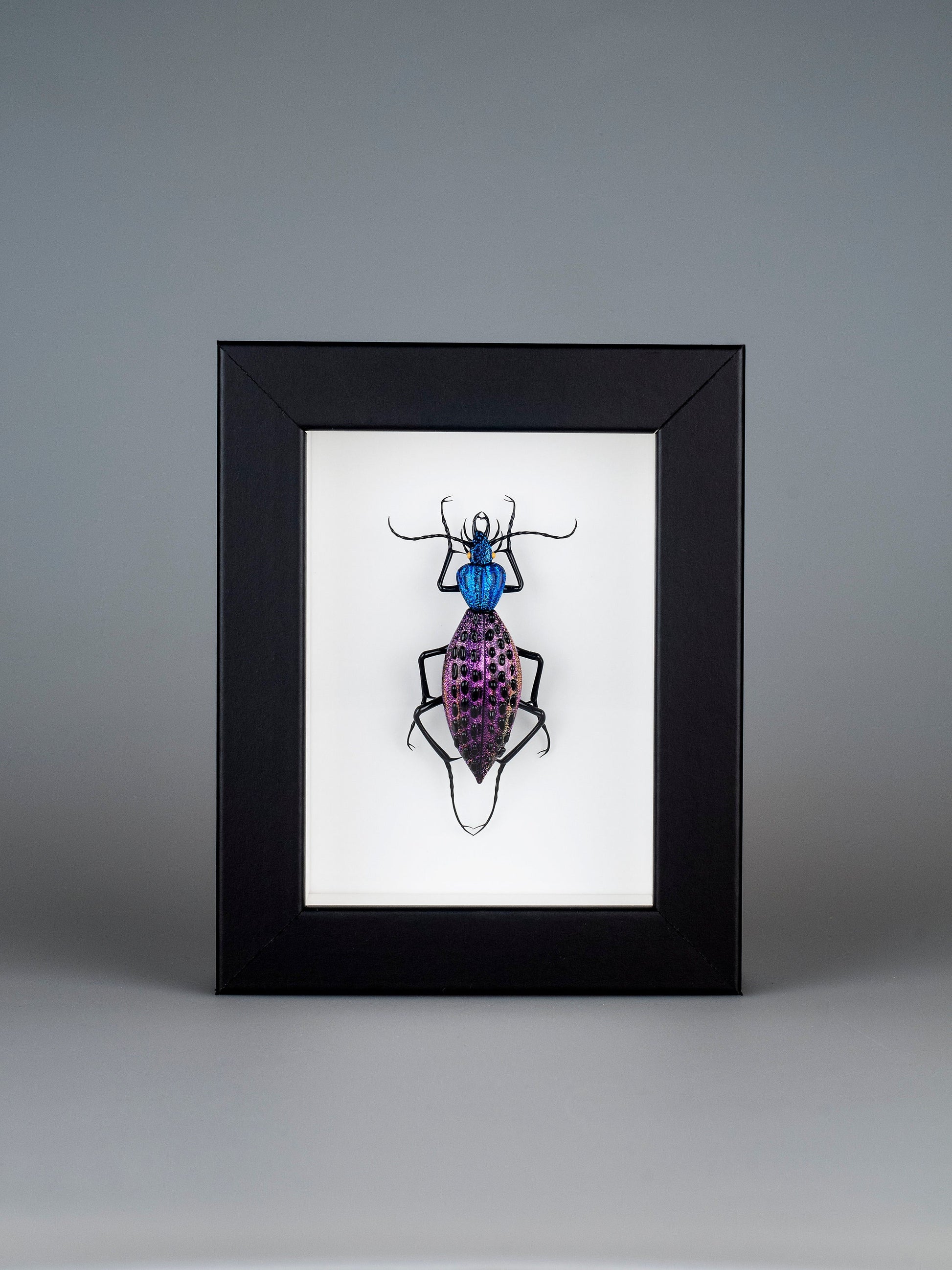 Scarabeo di vetro realizzato a lume con una cornice in legno nero. Il pezzo è realizzato con vetro di Murano