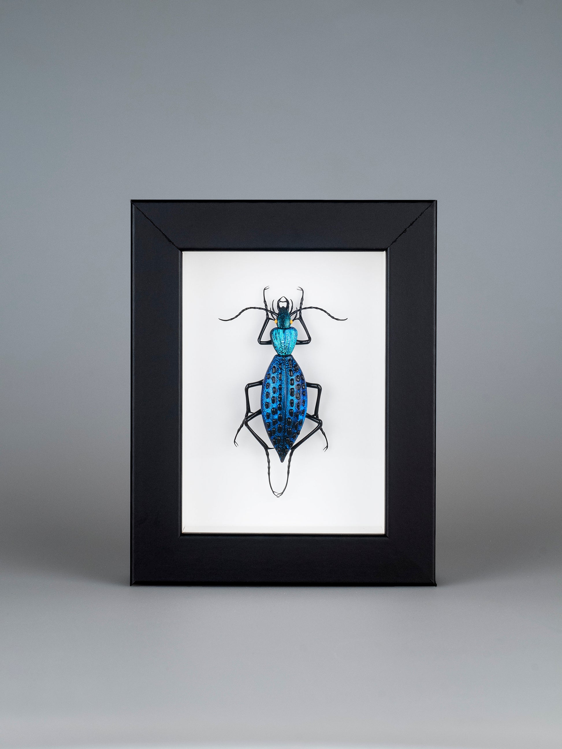 Scarabeo in vetro realizzato a lume con cornice in legno nero.